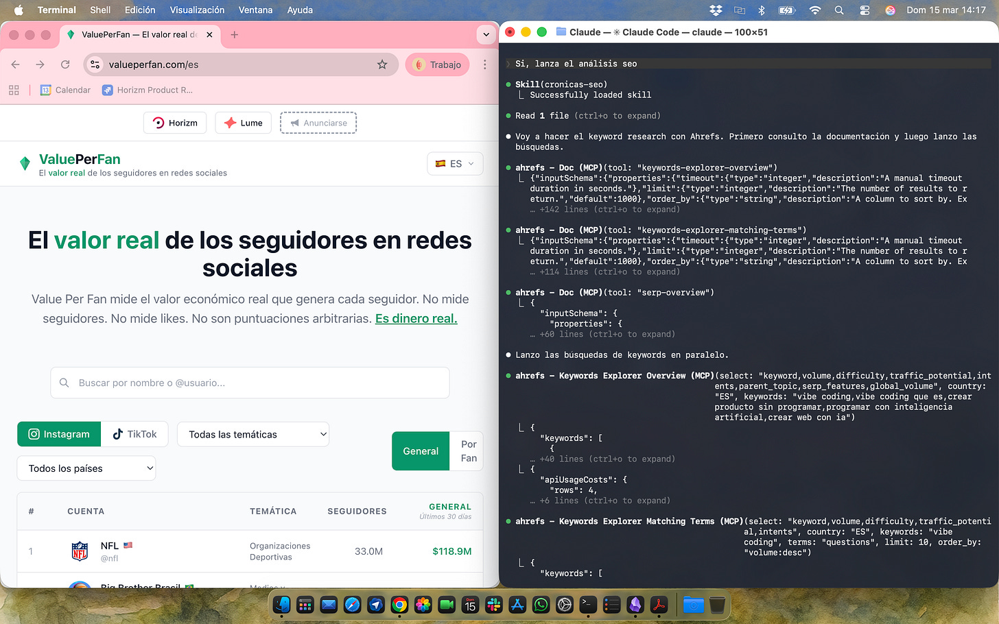 Llevaba meses con ValuePerFan en la cabeza. La idea era clara: coger el algoritmo de valoración económica que tenemos en Horizm y hacerlo público, que cualquier creador pudiera ver cuánto vale su cuenta en redes sociales. Un producto con sentido, con datos reales, con un modelo de negocio detrás. Pero no podía abordarlo. En Horizm el equipo estaba a tope con otras prioridades, y montar esto requería diseñador, programador, semanas de trabajo. Así que ahí seguía, en el cajón de las buenas ideas que nunca se ejecutan.